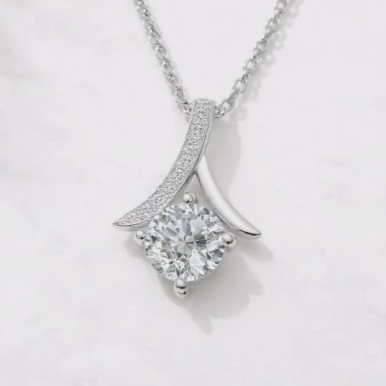 Elevate your jewelry collection with the refined brilliance of this 925 Sterling Silver Moissanite Elegance Pendant Necklace. Featuring a radiant round-cut moissanite at its center, this design is secured in a classic four-prong setting that maximizes light reflection for exceptional sparkle. A delicately curved silver bar, adorned with pavé-set accent moissanites, adds a graceful, modern touch to the silhouette. Suspended from a sleek sterling silver chain, this necklace balances timeless sophistication with contemporary charm.